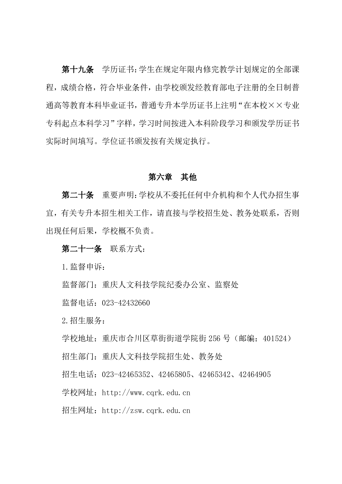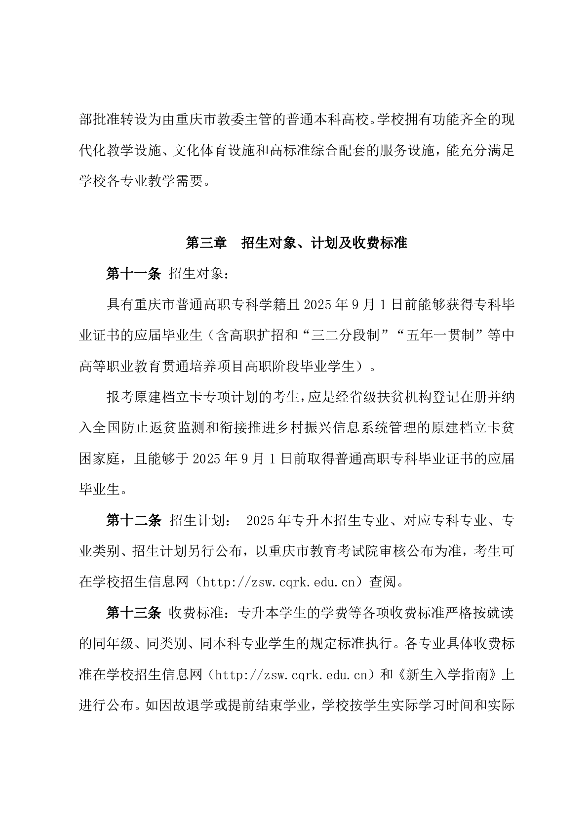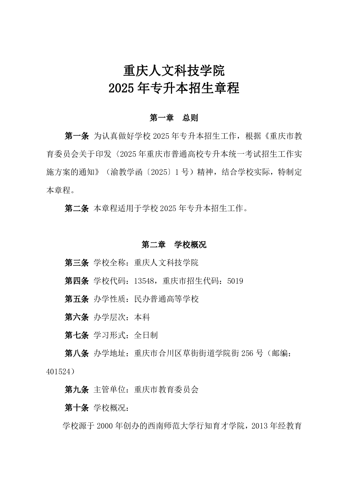 重庆人文科技学院2025年专升本招生章程