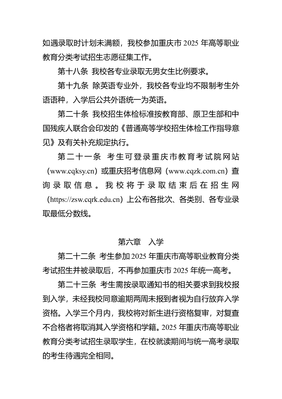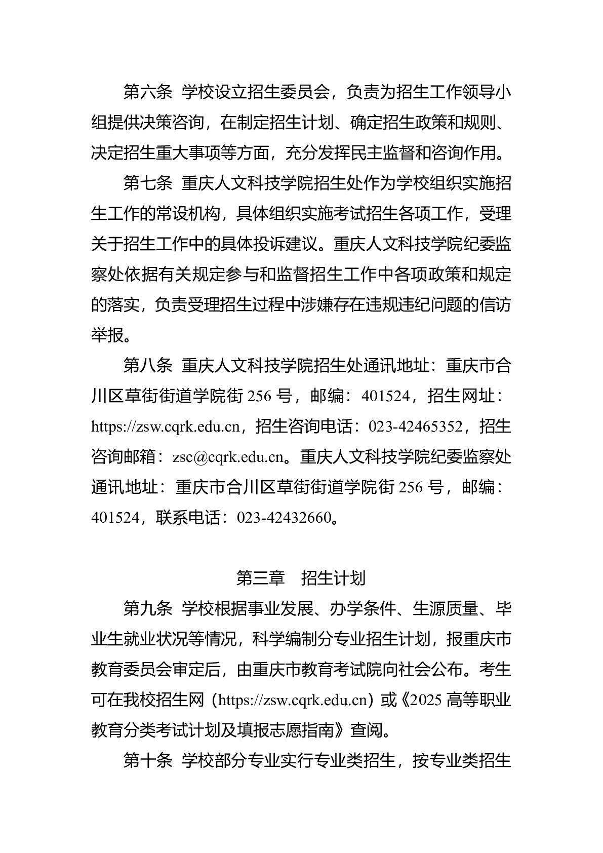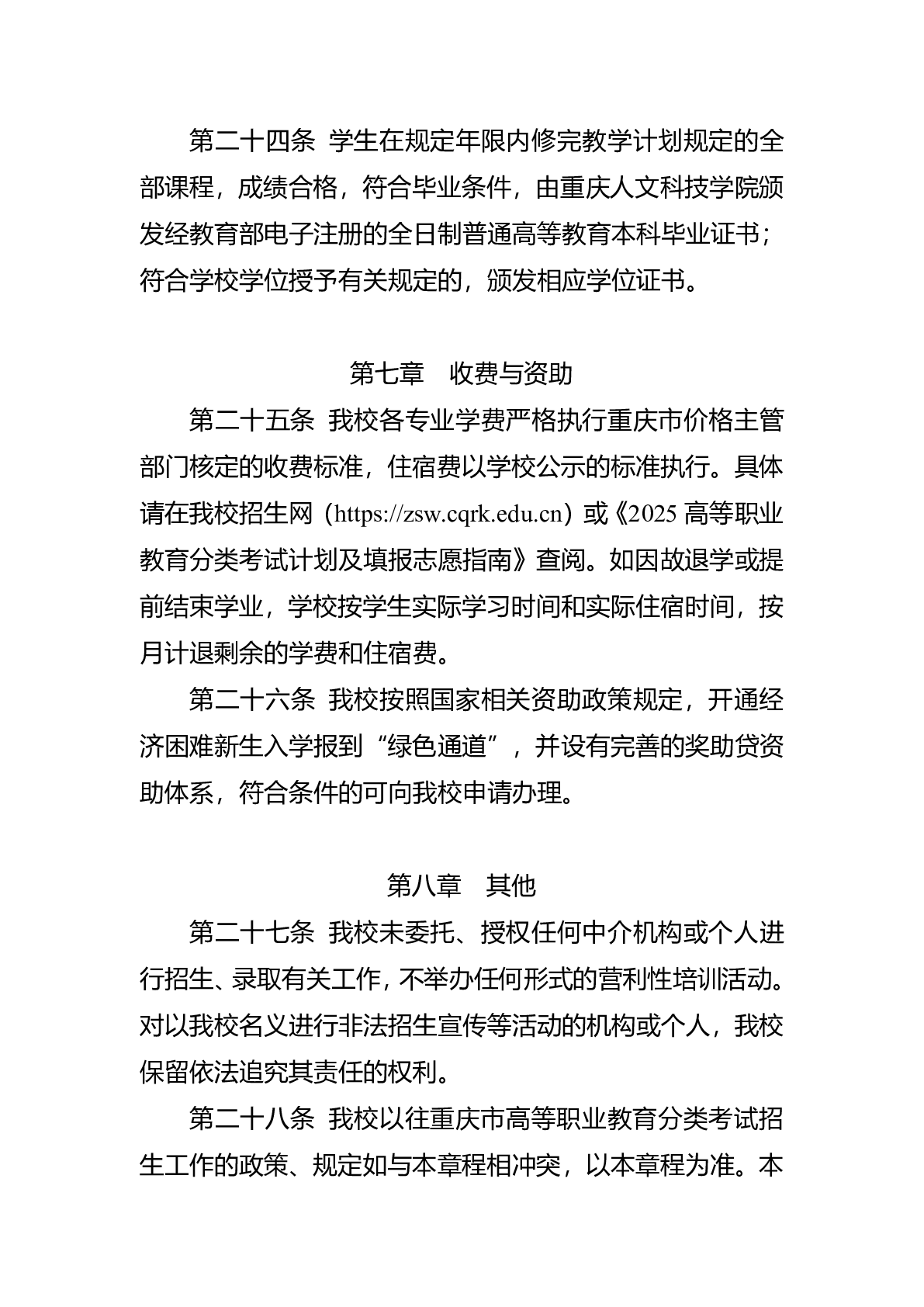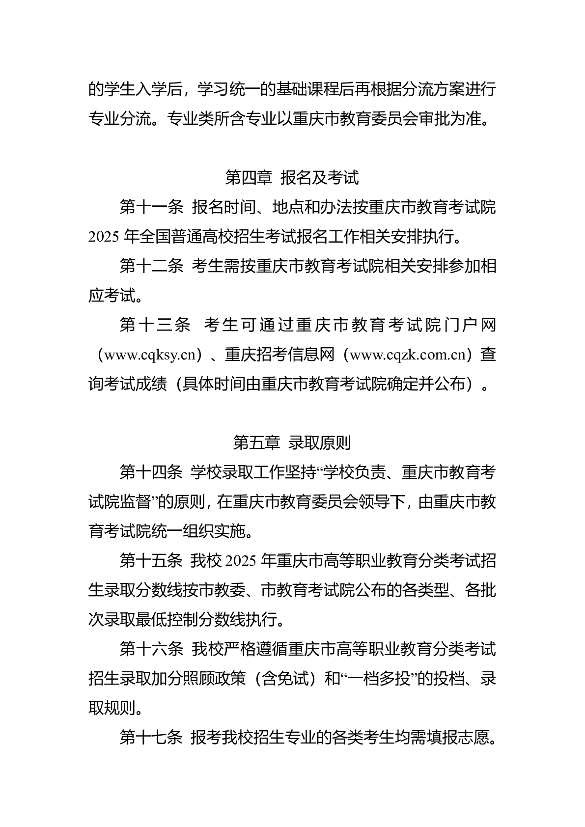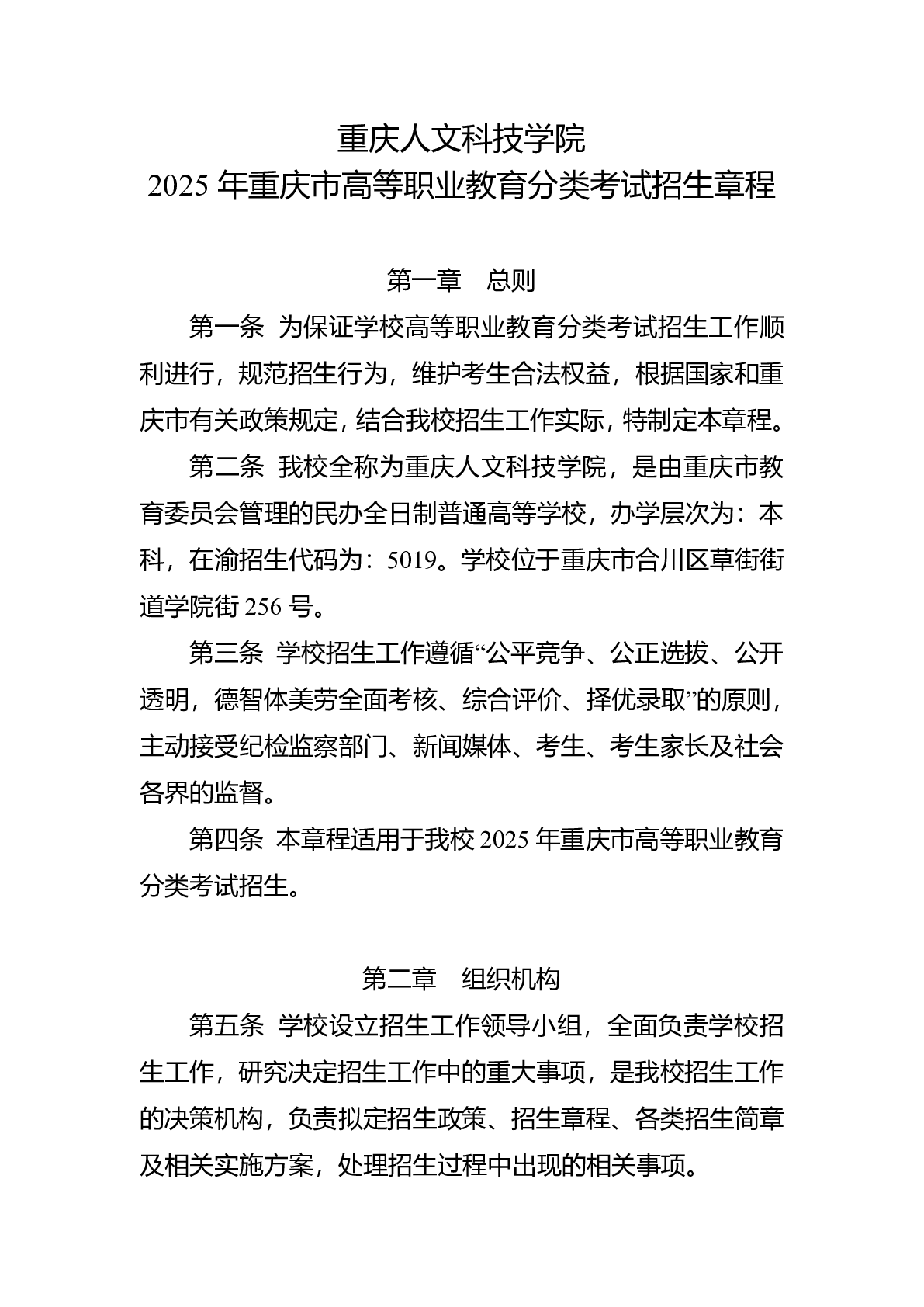 重庆人文科技学院2025年重庆市高等职业教育分类考试招生章程