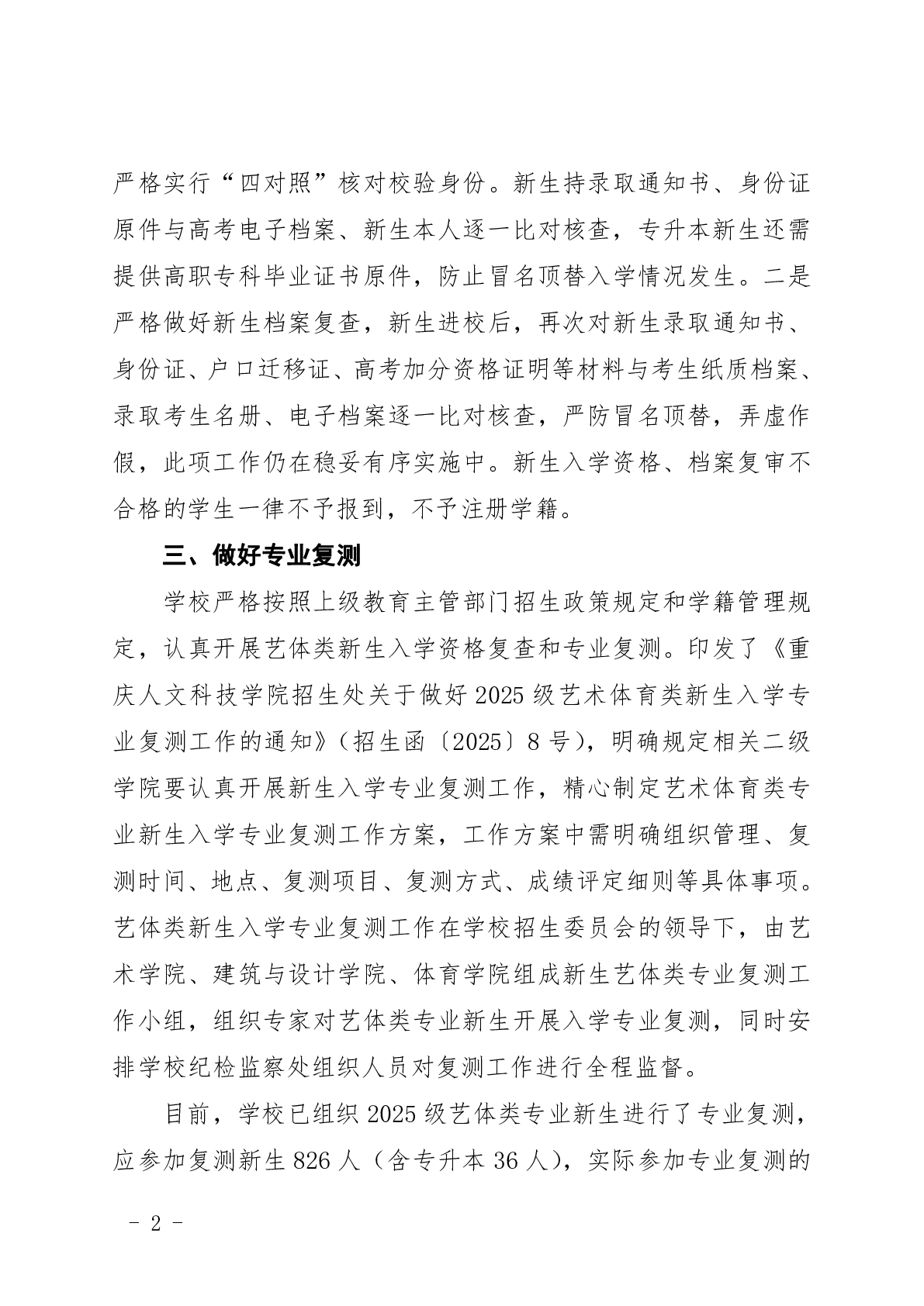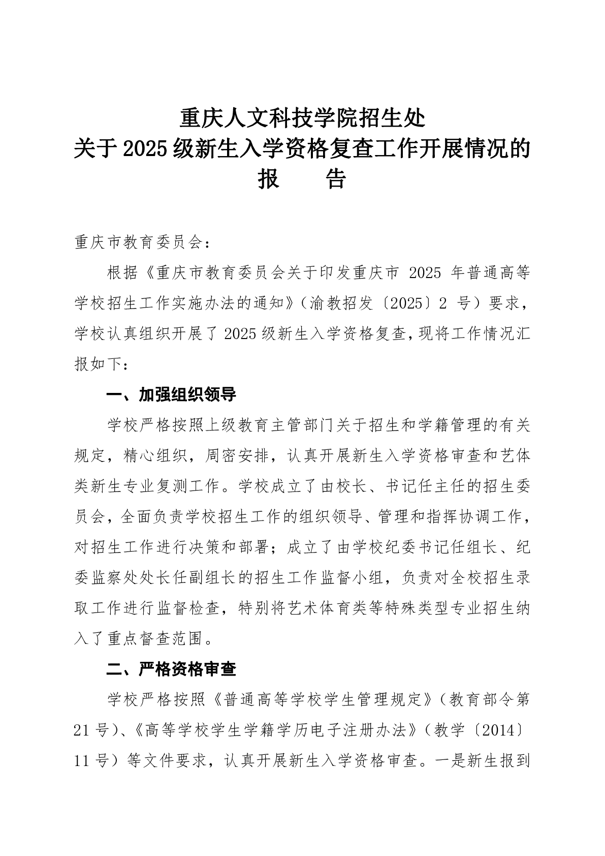 重庆人文科技学院招生处关于2025级新生入学资格复查工作开展情况的报告
